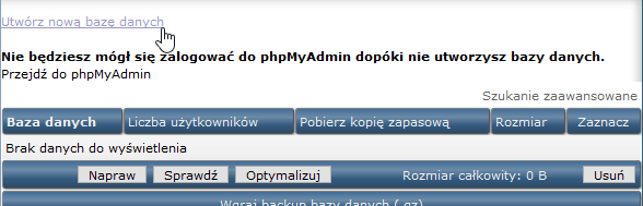 Następnie kliknąć „Utwórz nową bazę danych”. Pamiętaj! Nie będziesz mógł zalogować się do phpMyAdmin dopóki nie założysz bazy danych.