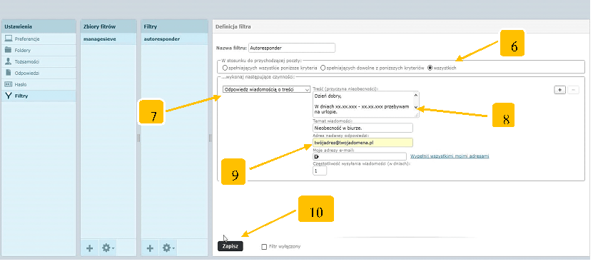 5. Dalej wpisz nazwę swojego filtru, np. Autoresponder, wiadomość wakacyjna itp.